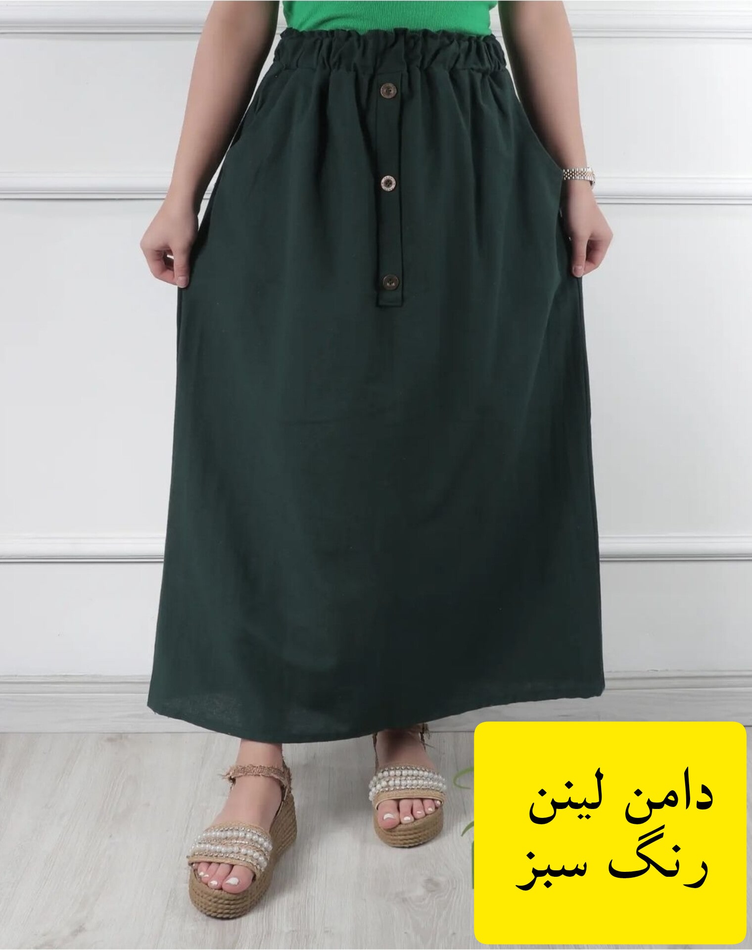 دامن لینن نچرال راسته پارچه لینن شسته شده بدونخ آبرفت کمر کشی جلو دامن سه تا دکمه نما داره دور باسن 140-قد95 مناسب برای سایز 38تا48 سفید و سبز
